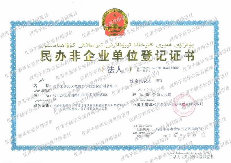 「荒野新疆」(注册名:乌鲁木齐沙区荒野公学自然保护科普中心),是一家以志愿者社群为基础,致力于自然保护科普传播工作的公益机构,2012年由新疆本地自然探索爱好者和保护行动志愿者发起,2017年正式注册。让自然保护触手可及是我们的心愿,我们希望在自然保护的参与中成就更好自己,守护更美家园。