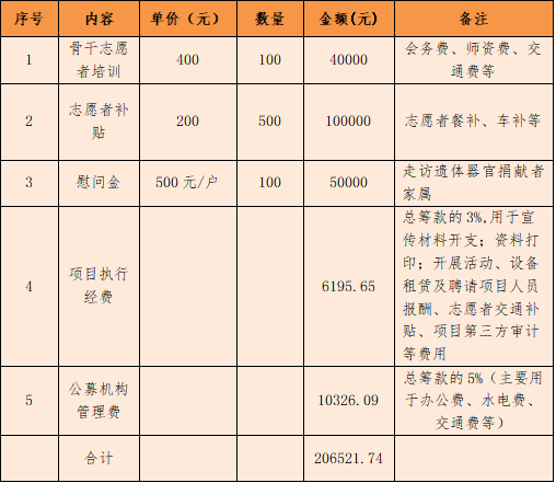 通过募集善款,为市红十字生命之花志愿服务队提供更充裕的工作经费,用于慰问遗体器官捐献者家属和困难志愿者。
