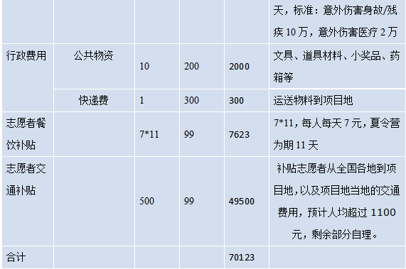 计划召集99名大学生志愿者,297名留守儿童参与本次活动。每3名志愿者将与9个孩子组成一队,志愿者每日晚上宿于学校,白天去到孩子家,与孩子完成以下两个模块夏令营活动任务。