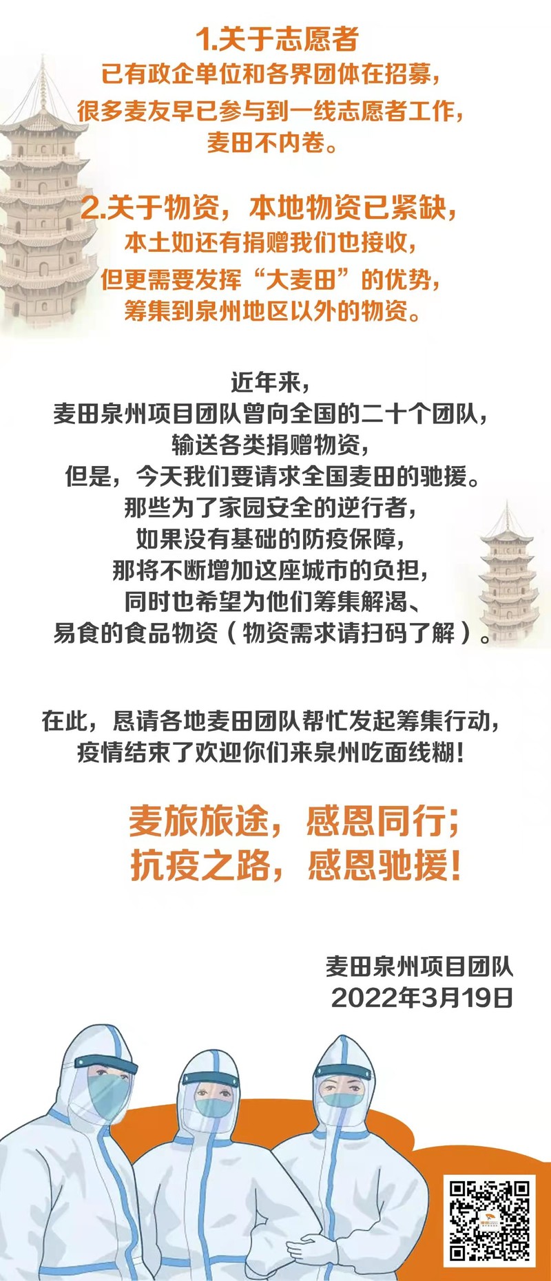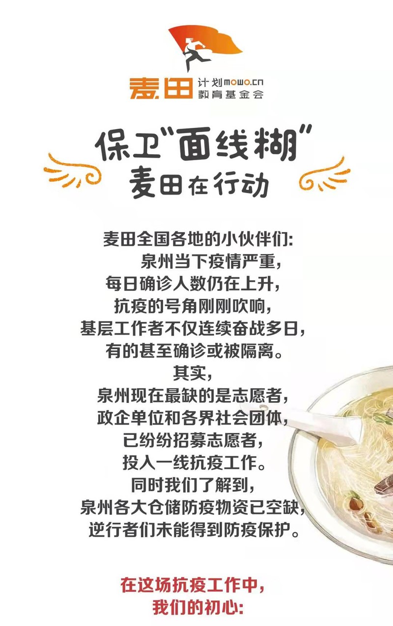 防疫工作不仅仅是一线医护人员的职责,社区工作者、志愿者一直在行动,社区工作者负责全员核酸检测;救援队参与公共场所的消杀工作;志愿者参与维护秩序、解决居民食品保障、照顾孤寡老人民生问题、卡点排查工作。麦田教育基金会也迅速反应,拟发起“保卫面线糊,麦田在行动”公益项目,进行公开筹集物款,为泉州防疫工作者筹集防护服、口罩、消杀用品等防疫物资,以最快的速度将抗疫物资发放到有需要的区域。