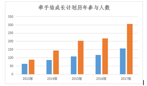 牵手结对于2012年12 月由我们弘慧大学生发起并开展,每年度参与该项目的大学生志愿者人数及被走访的中小学生人数都呈现出稳步增长,迄今为止累计参与的弘慧大学生人数达到了377人,被走访的中小学生人次超过630人,送出的暖心包裹600余个,且80%以上的牵手组合保持联系。