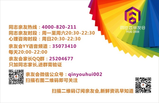 我们是谁: 同性恋亲友会(英文简称PFLAG China,意为中国男女同性恋者的父母、家人和朋友)成立于2008年,为中国的LGBT群体和亲友提供支持服务。同性恋亲友会是一个独立的草根组织,不属于任何组织的分部。